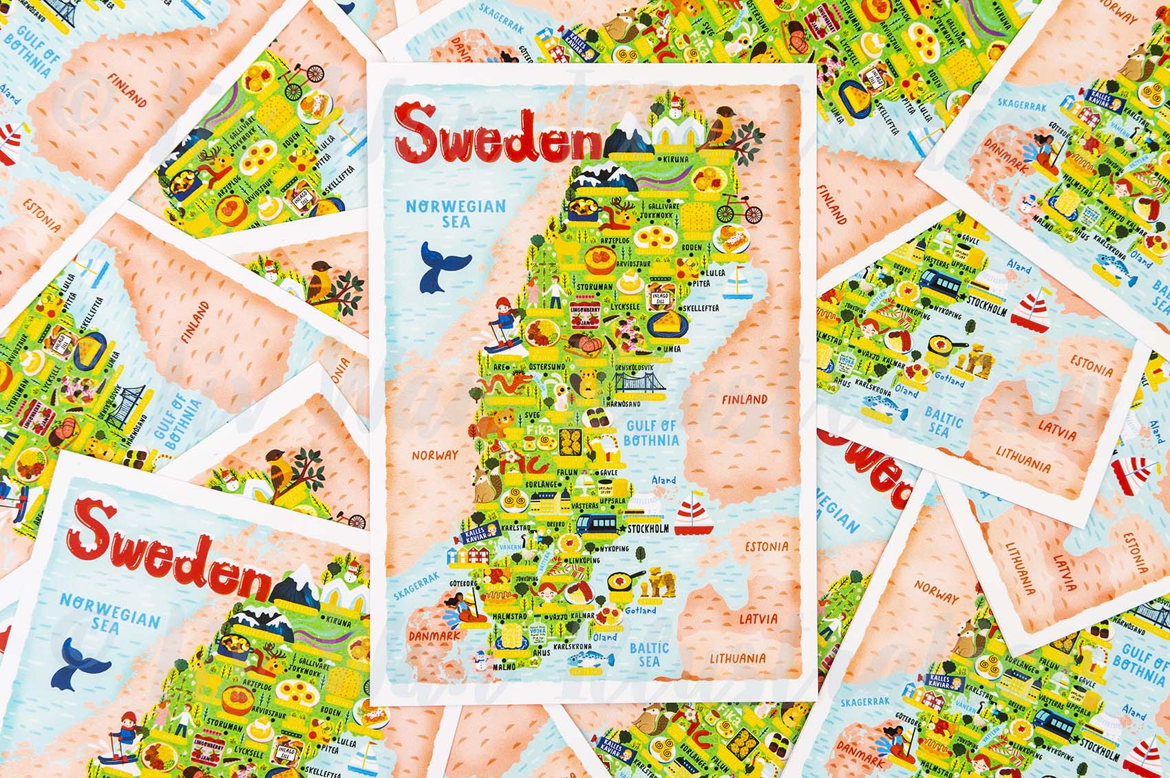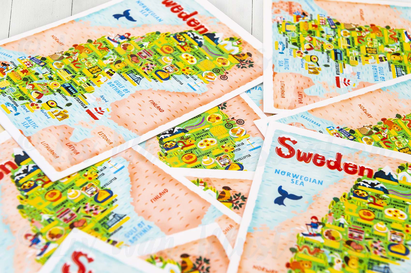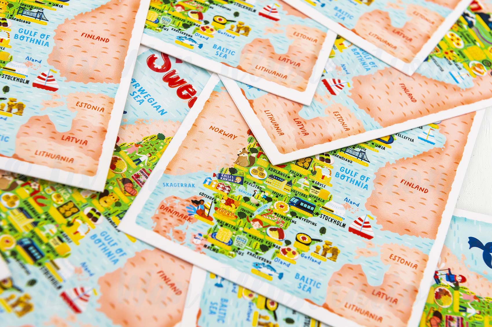This Sweden map postcard has been printed by Moggy Mansions on beautiful heavyweight cotton rag paper. This is a fine-art paper that has a beautiful texture, great colour reproduction and perhaps most importantly is absolutely lovely to write on.
