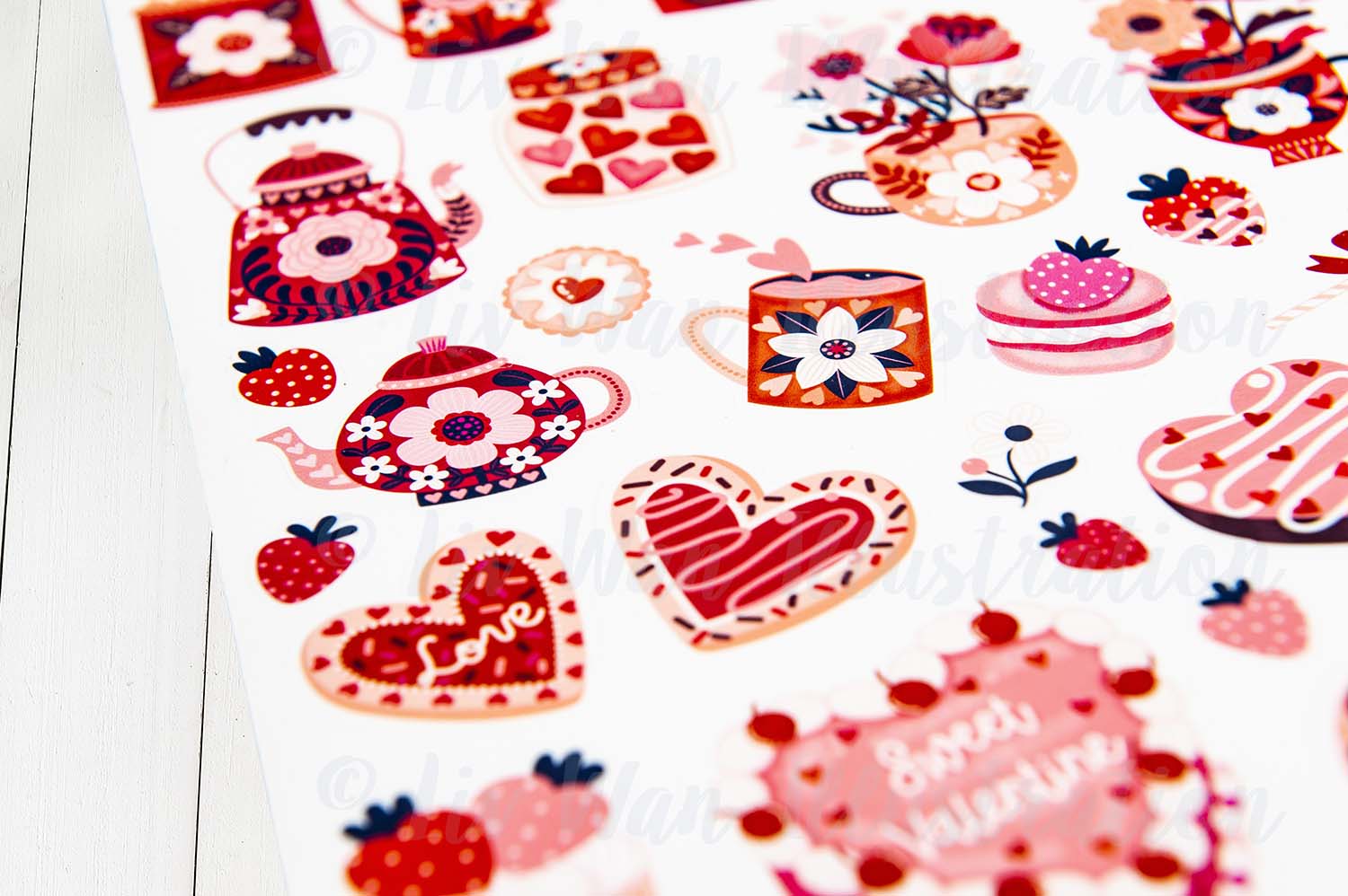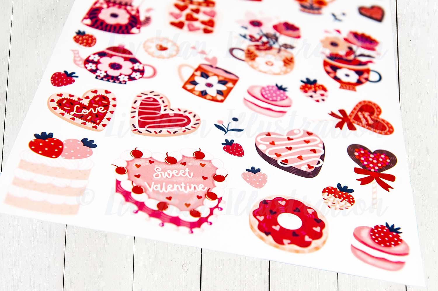 This listing is for a single Sweet Valentine Sticker Sheet 6×9 inch sheet that includes 31 removable gloss stickers. Stickers range from 1.5 inches to 2.5 inches in size. The smallest stickers start at 0.4 inches.