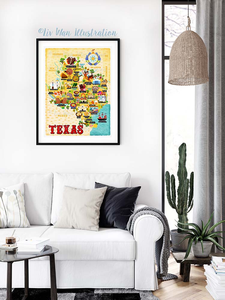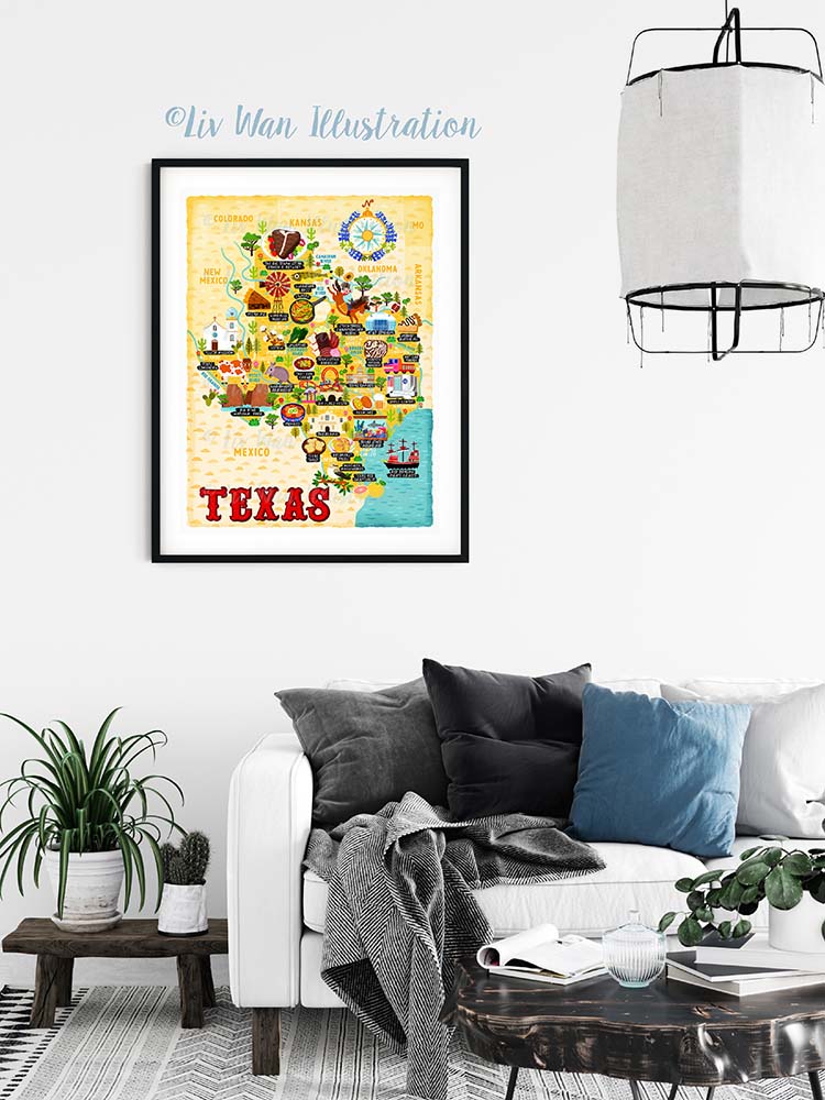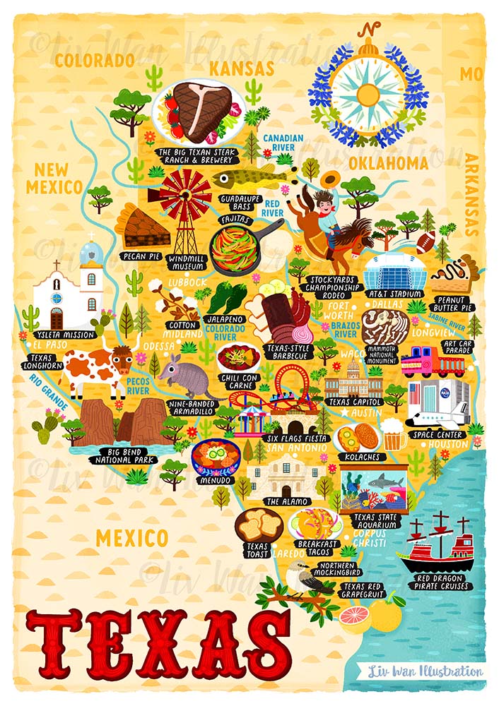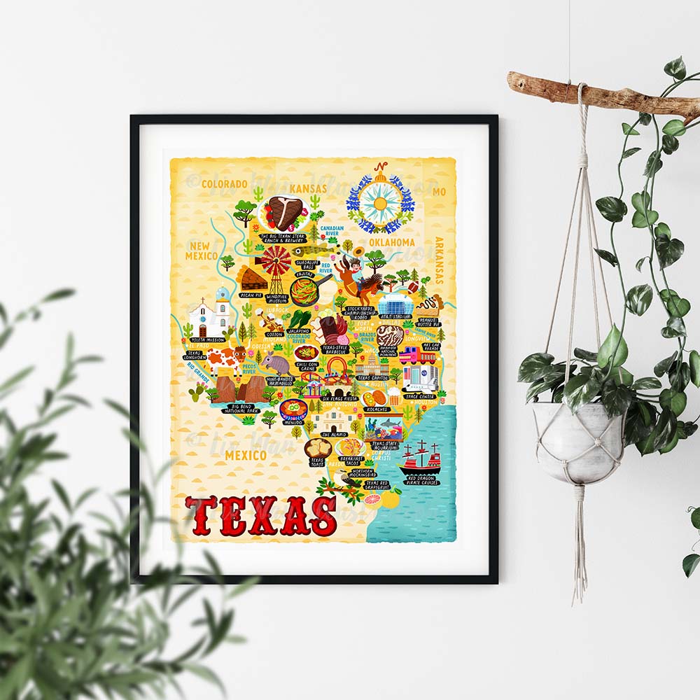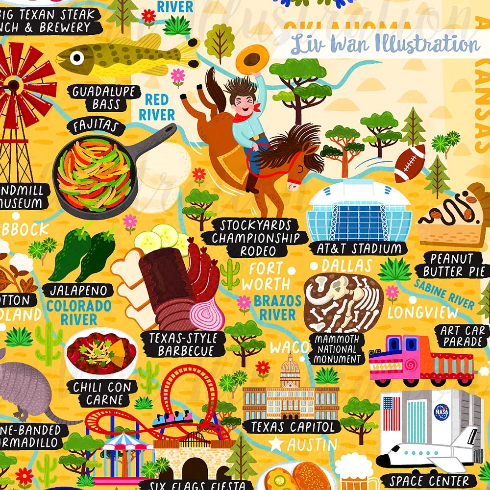 As with all of my maps, there are absolutely tonnes of detail in this Texas Map Poster. There are people, buildings, cities, animals, food and many other things.