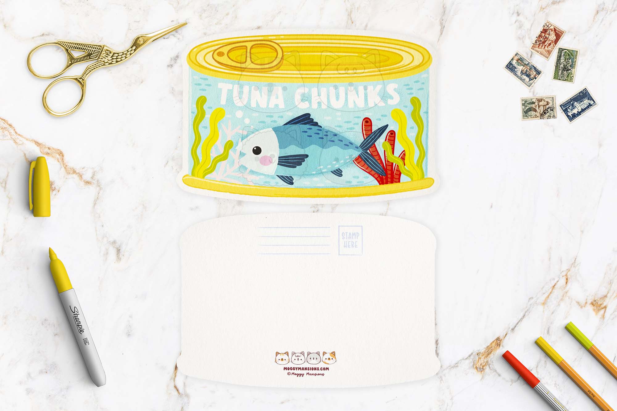 This Tinned Tuna Postcard is A6 (10.5 × 14.8cm) in size and is printed by Moggy Mansions on beautiful heavyweight cotton rag paper. This is a fine-art paper that has a beautiful texture, great colour reproduction and perhaps most importantly is absolutely lovely to write on.