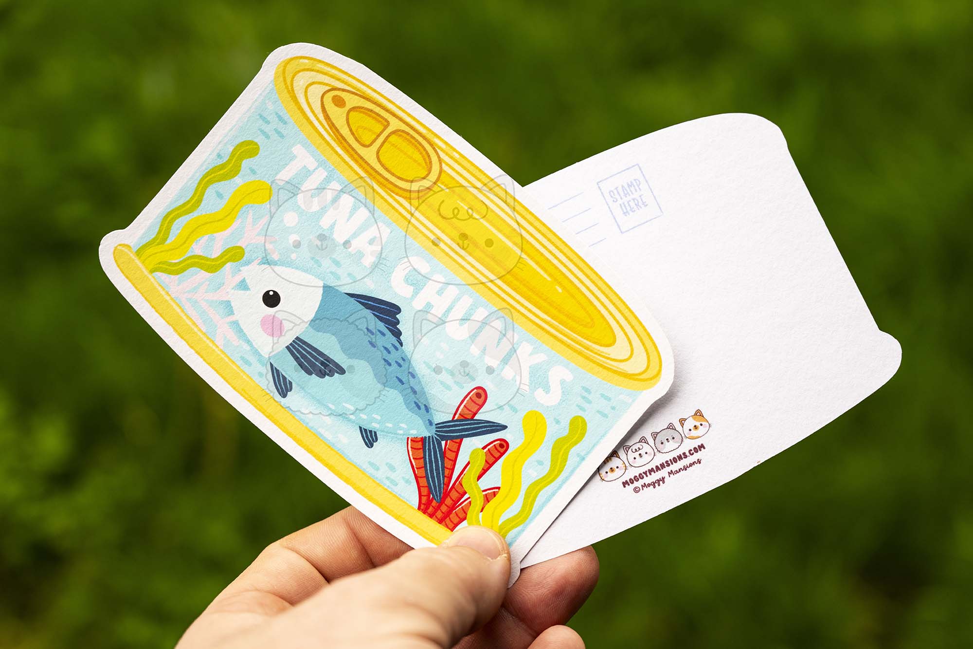 Introducing our Tinned Tuna Postcard. In 2024 we created a collection of really fun die-cut shaped pantry postcards and we’ve wanted to extend this collection for some time, so beginning of 2026 this is one of a few new postcards for this collection.