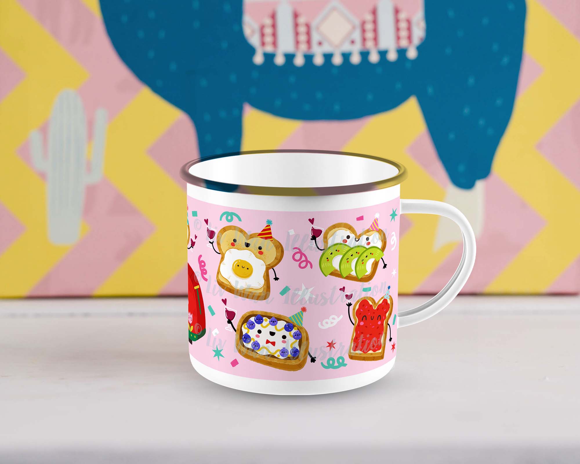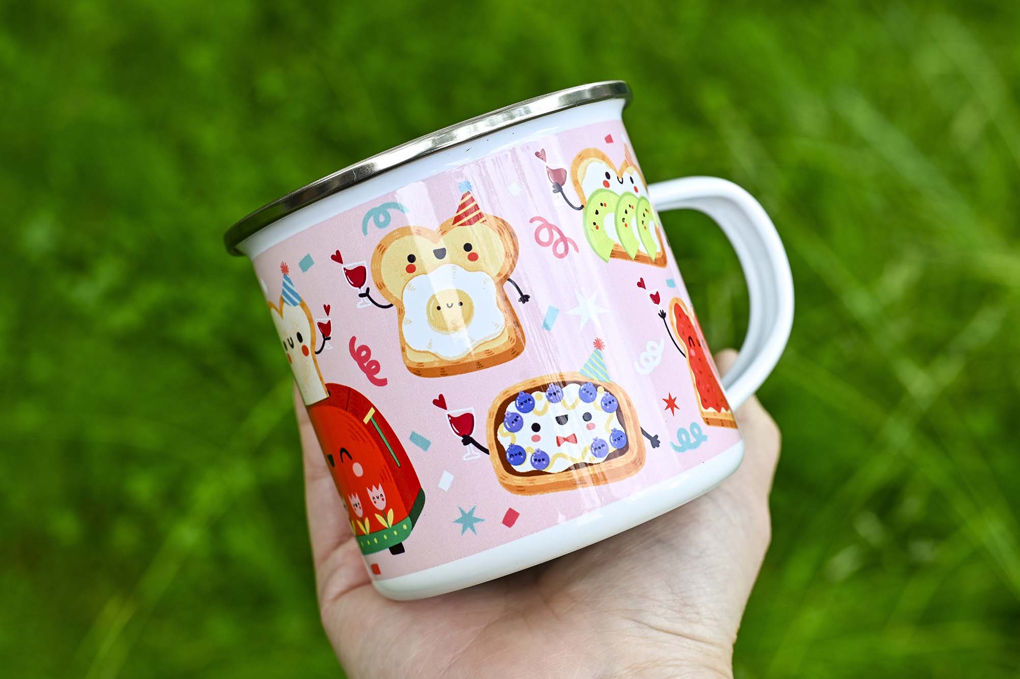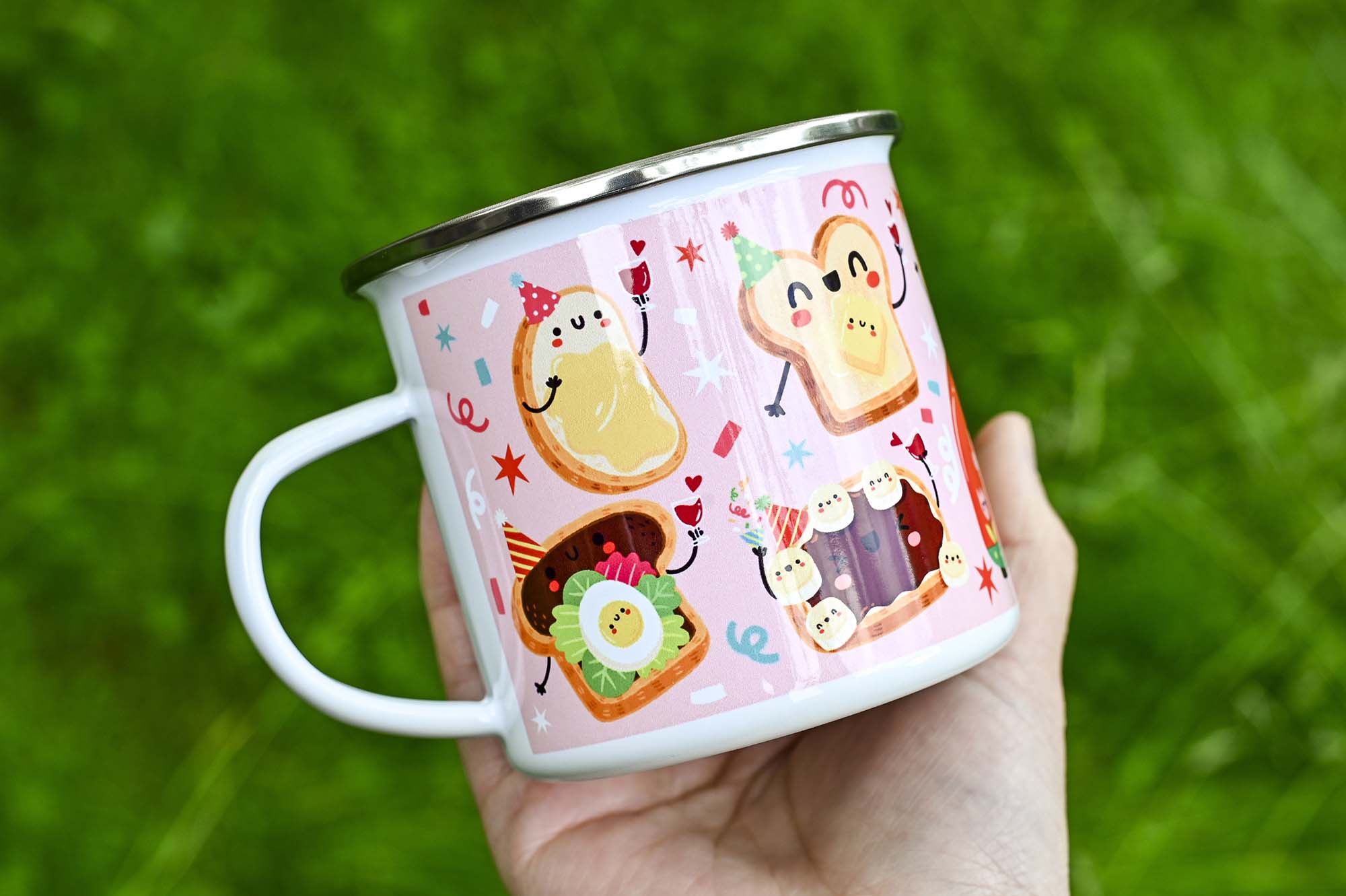 12-ounce enamel mug with a fun toast theme. Over the last few years I’ve had the pleasure of creating many different pattern designs for a number of clients so for 2024 I’ve made a whole series of new enamel mugs using my pattern designs.