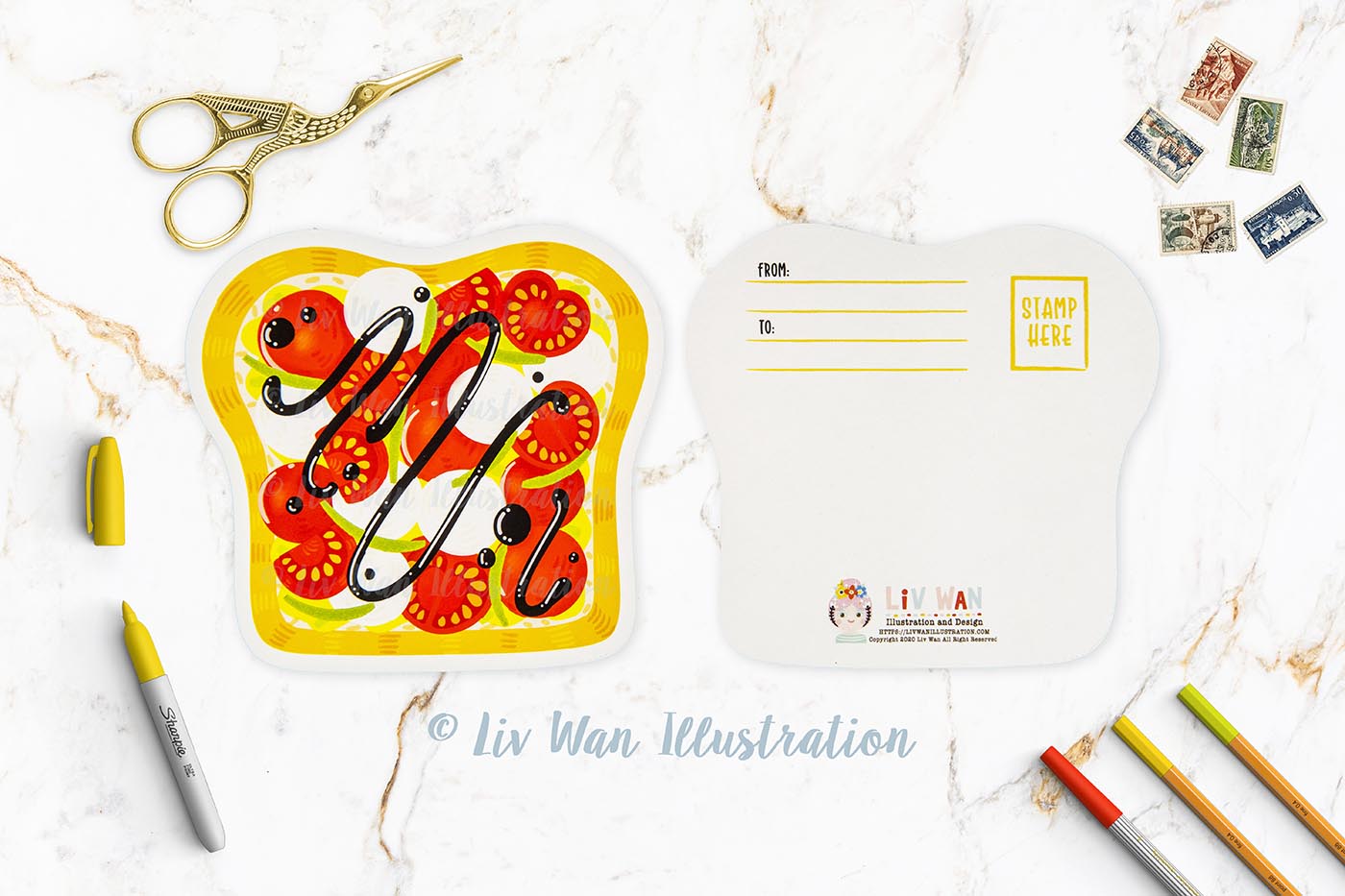 This Tomato Toast Postcard is A6 (10.5 × 14.8cm) in size and is printed by Moggy Mansions on beautiful heavyweight cotton rag paper. This is a fine-art paper that has a beautiful texture, great colour reproduction and perhaps most importantly is absolutely lovely to write on.