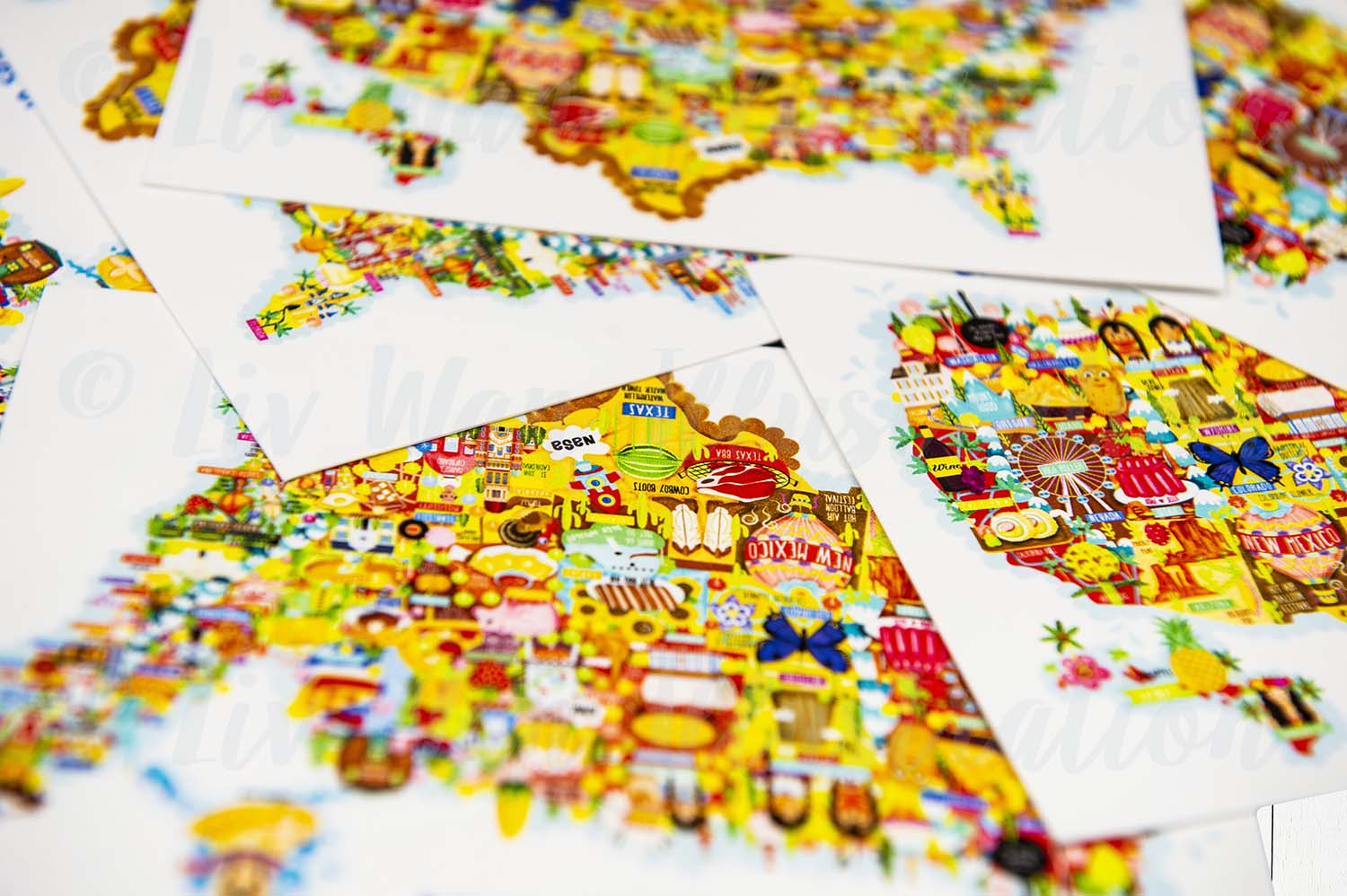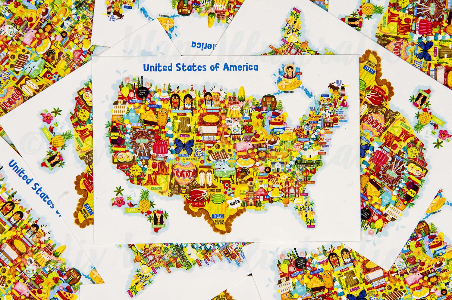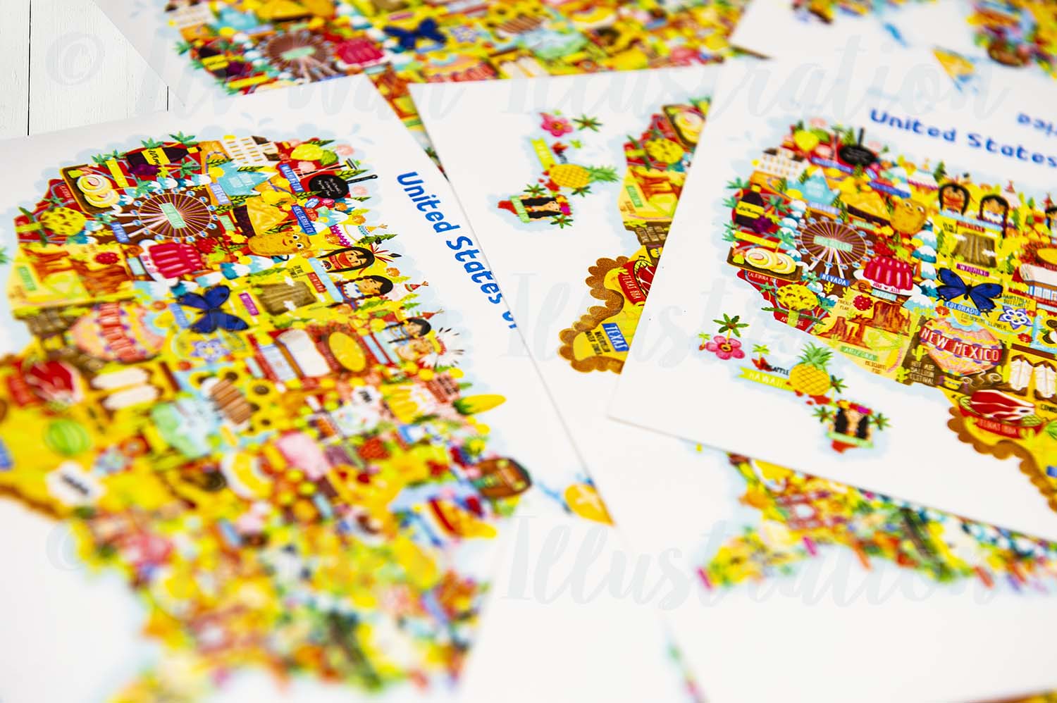 If you are collecting beautiful, unique, and special postcards, this USA map postcard illustration should definitely be added to your collection. I’m now doing a wholesale service, so if you are a retailer and you’re interested in my postcards, prints, or any of the other products I have listed on my website, please contact me anytime.