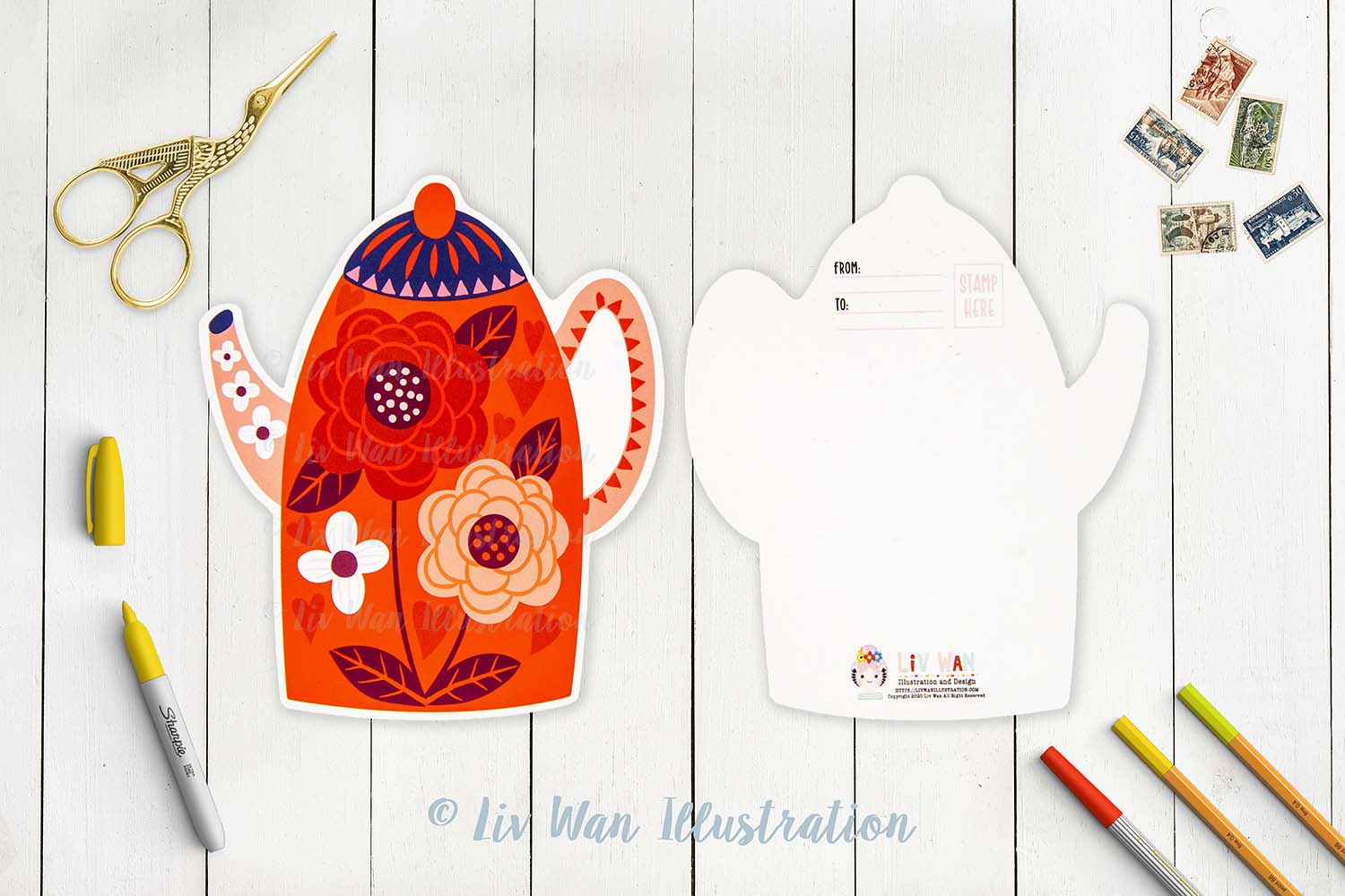 This Valentines Coffee Pot Postcard is 5.6 x 5.1 inches (14.2 x 13cm) in size and is printed by Moggy Mansions on beautiful heavyweight cotton rag paper. This is a fine-art paper that has a beautiful texture, great colour reproduction and perhaps most importantly is absolutely lovely to write on.