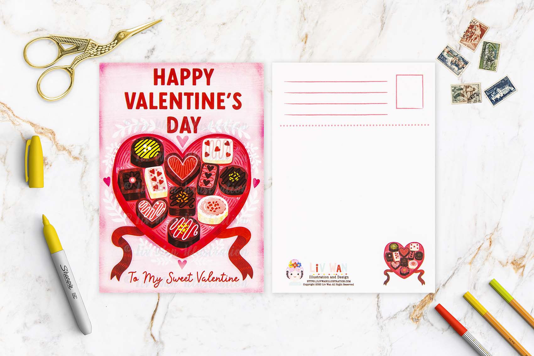 This Valentine’s Day Chocolates Postcard has been designed and made by myself. There has been no outsourcing and no printing in a foreign country whatsoever. This ensures this product is of the highest quality but also dramatically drops any carbon emissions. My aim is to keep everything as green as possible.