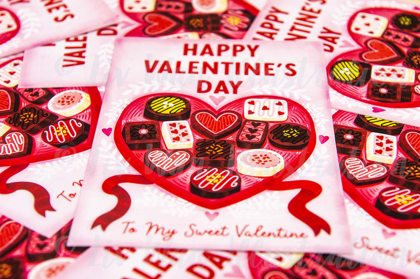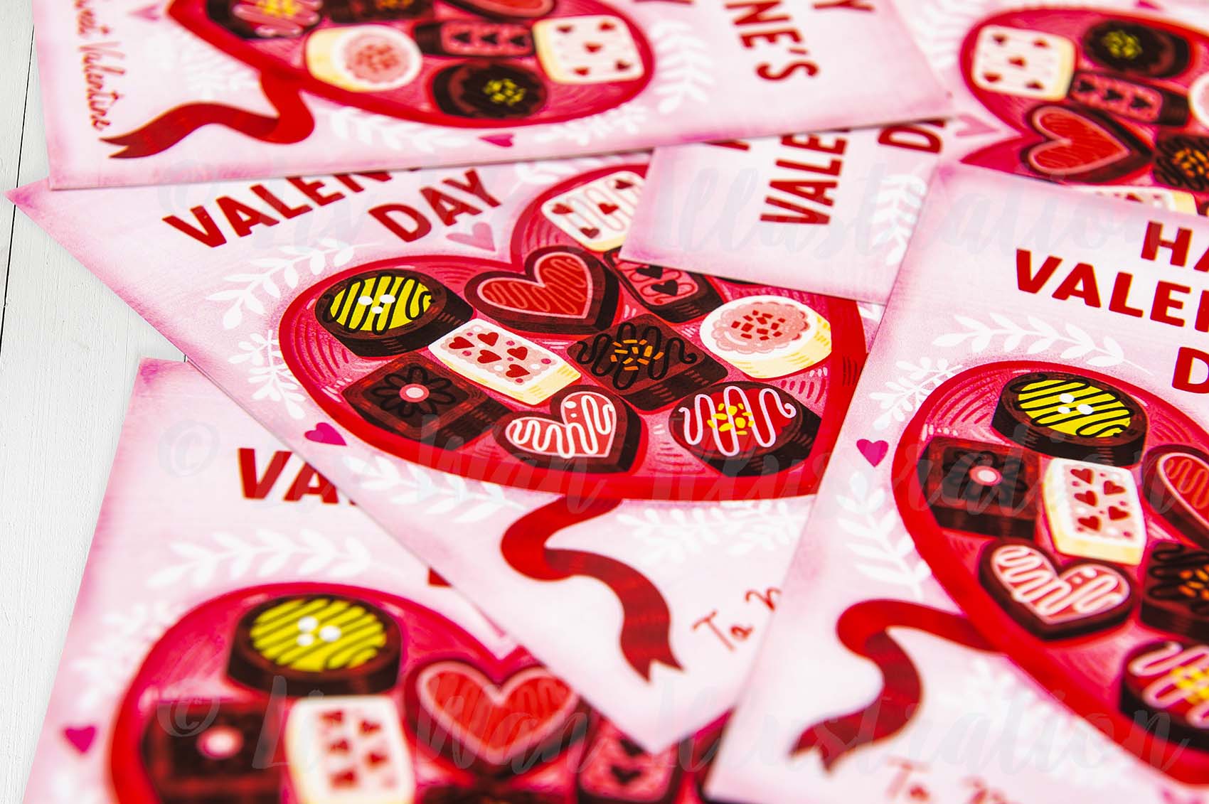 This Valentine’s Day Chocolates Postcard is A6 (10.5 × 14.8cm) in size and is printed on a beautiful heavyweight fine-art textured paper by myself, which provides beautiful colours, contrast, texture and is a joy to write on.