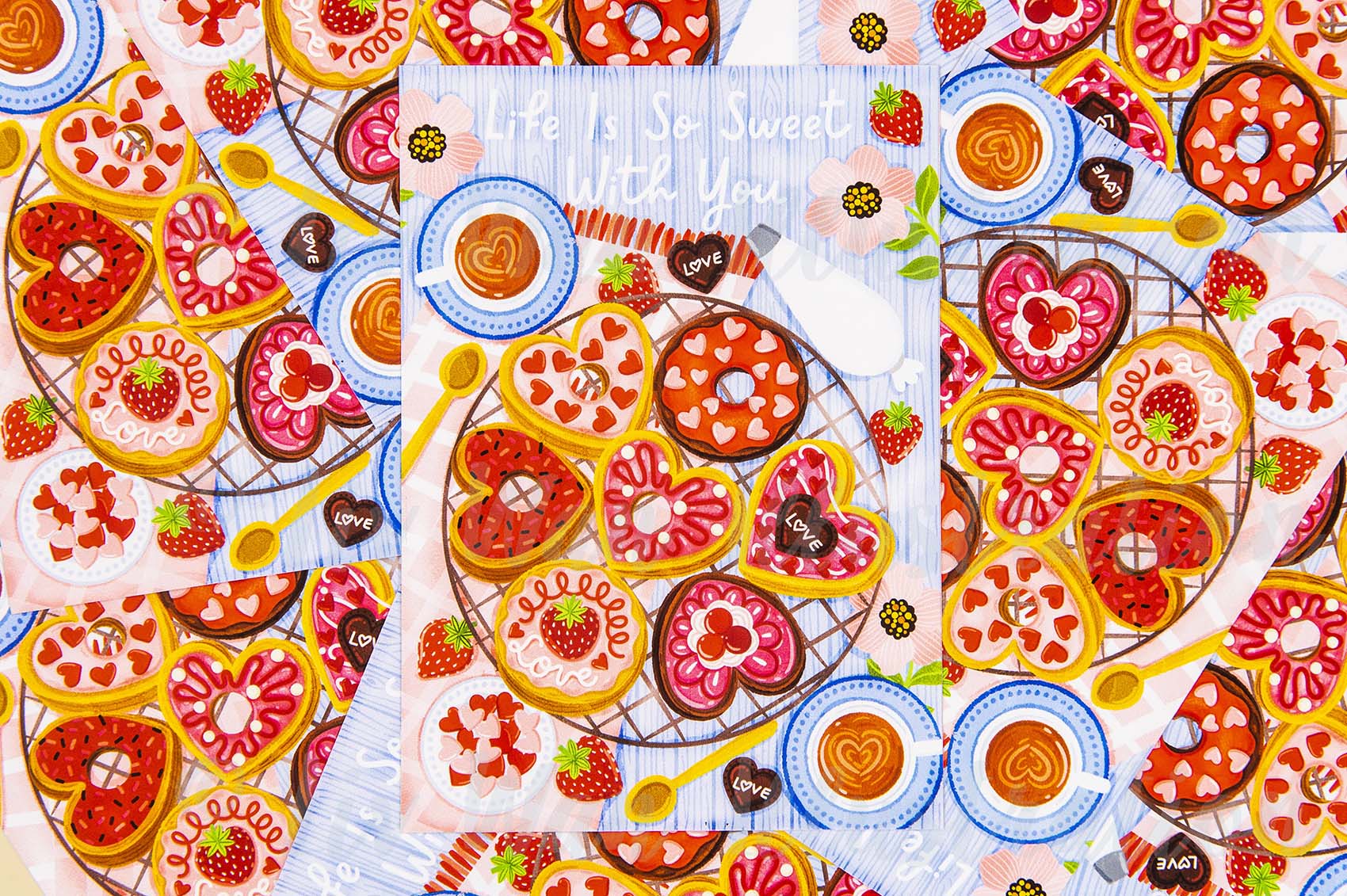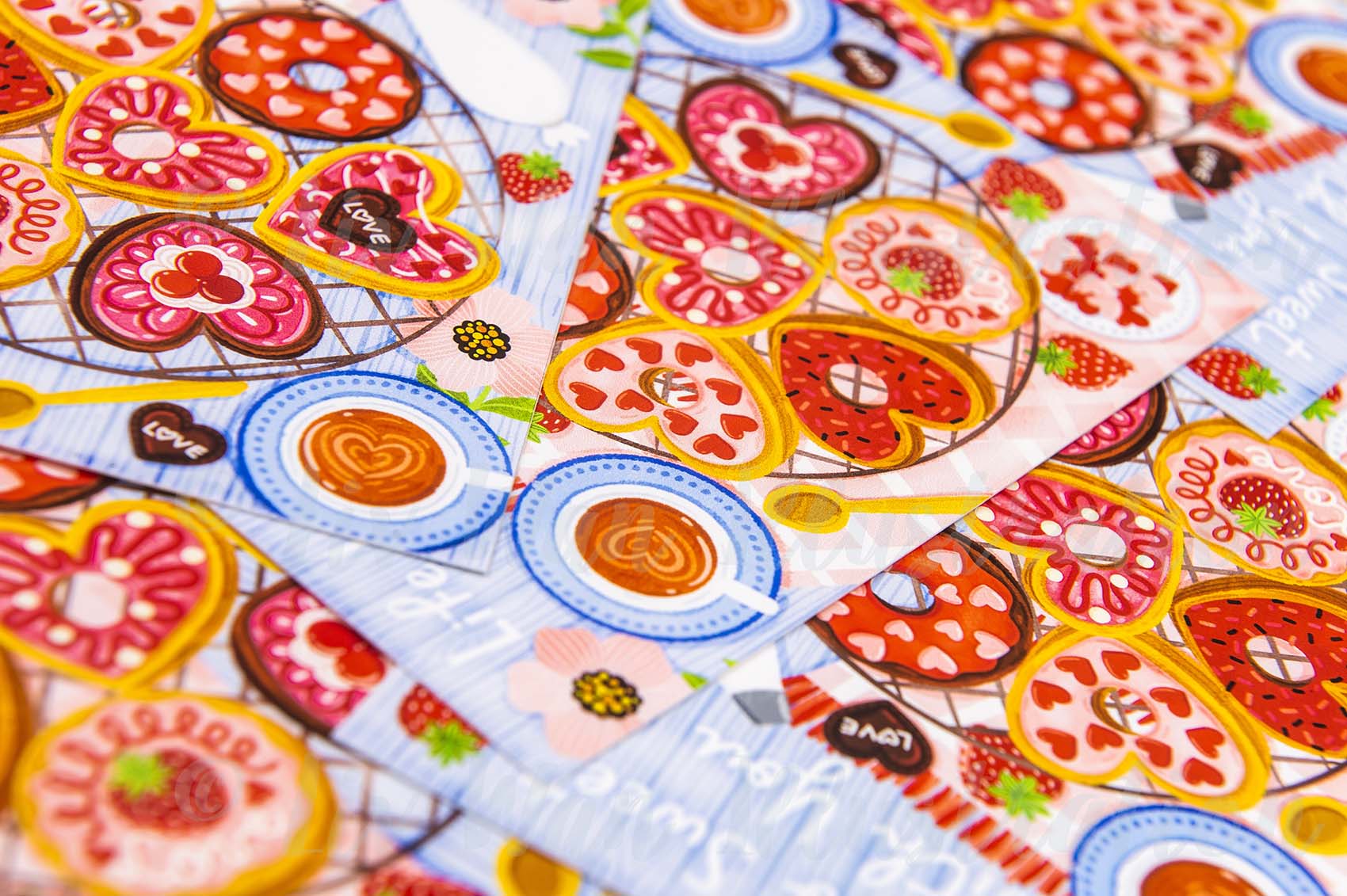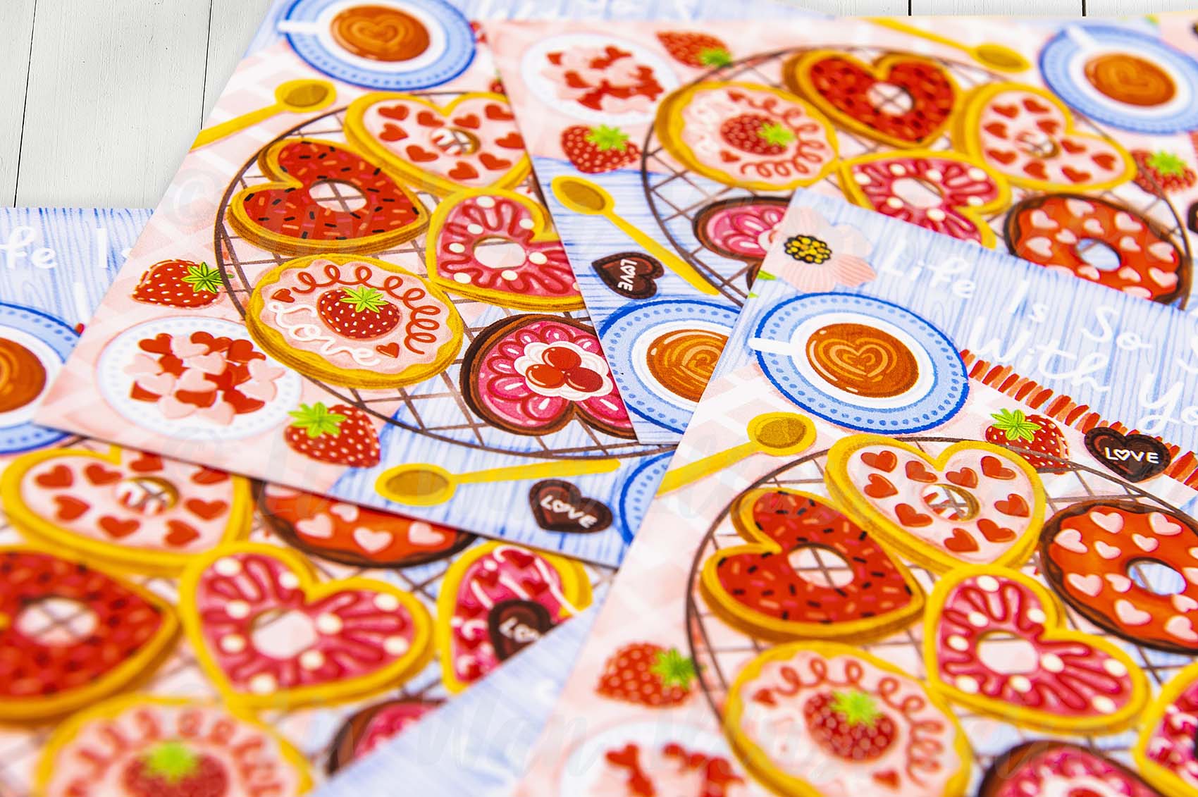 This Valentine’s Day Donuts Postcard is A6 (10.5 × 14.8cm) in size and is printed on a beautiful heavyweight fine-art textured paper by myself, which provides beautiful colours, contrast, texture and is a joy to write on.