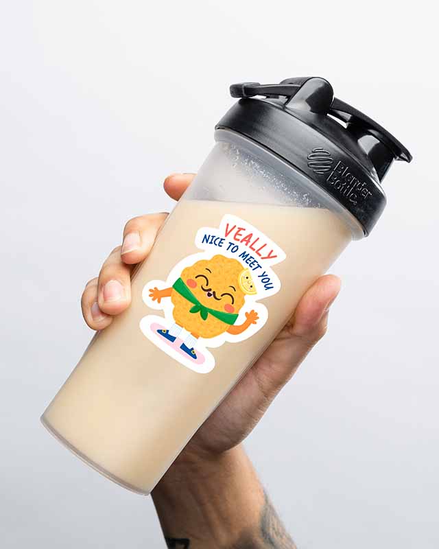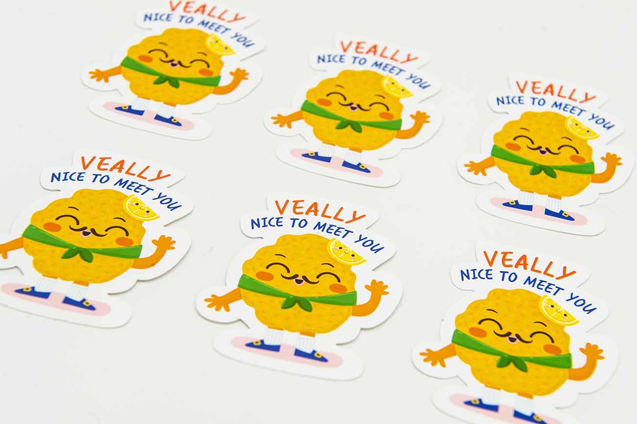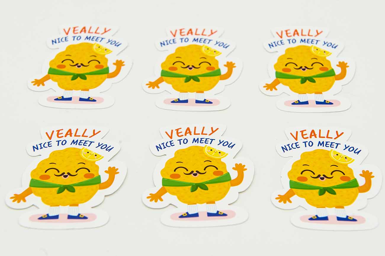 Features of this Veally Nice To Meet You Food Pun Sticker: