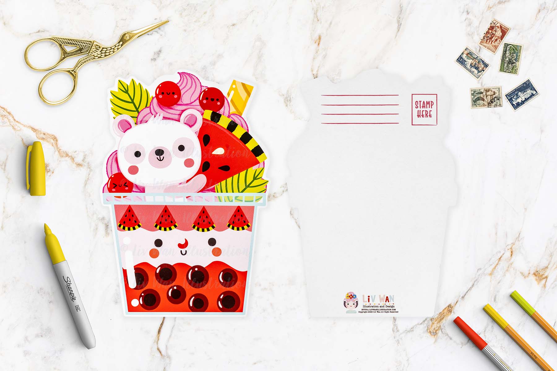 Brand new for summer 2023, I have created 14 super creative bubble tea postcards. I’m from Taiwan and have been drinking bubble tea for as long as I can remember, so combining my love of bubble tea, animals, colours and fun-related things, I made this Watermelon Panda Bubble Tea Postcard.